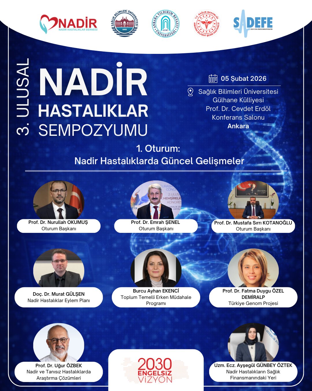 Bu yıl üçüncüsünü düzenleyeceğimiz Nadir Hastalıklar Sempozyumu’na sizleri davet etmekten büyük bir mutluluk ve heyecan duyuyoruz. Sempozyumumuz, 5 Şubat 2026 tarihinde Ankara’da, Sağlık Bilimleri Üniversitesi Gülhane Kampüsü Prof. Dr. Cevdet Erdöl Konferans Salonu’nda gerçekleşecektir.